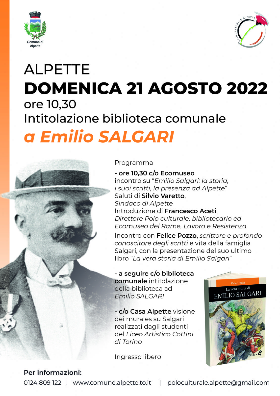 - ore 10,30 c/o Ecomuseo incontro su "Emilio Salgari: la storia, i suoi scritti, la presenza ad alpette"saluti di Silvio Varetto, sindaco di alpette