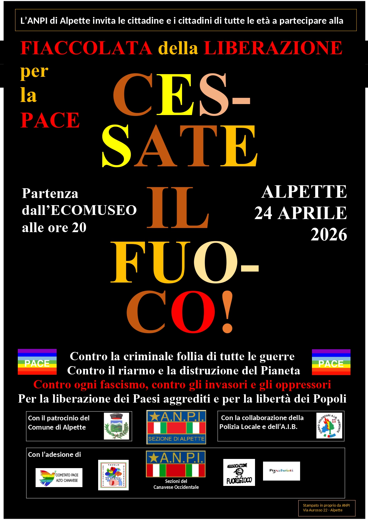 Il Comune di Alpette in collaborazione con la Sezione locale ANPI organizza la manifestazione civile con fiaccolata in data 24 aprile 2026 con partenza dall'Ecomuseo del Rame, Lavoro e Resistenza e arrivo davanti al Municipio e in data 25 aprile deposizione corona e fiori al cimitero comunale e monumenti vari e orazione in Piazza Goglio Battista "Titala", in allegato programma dettagliato.
