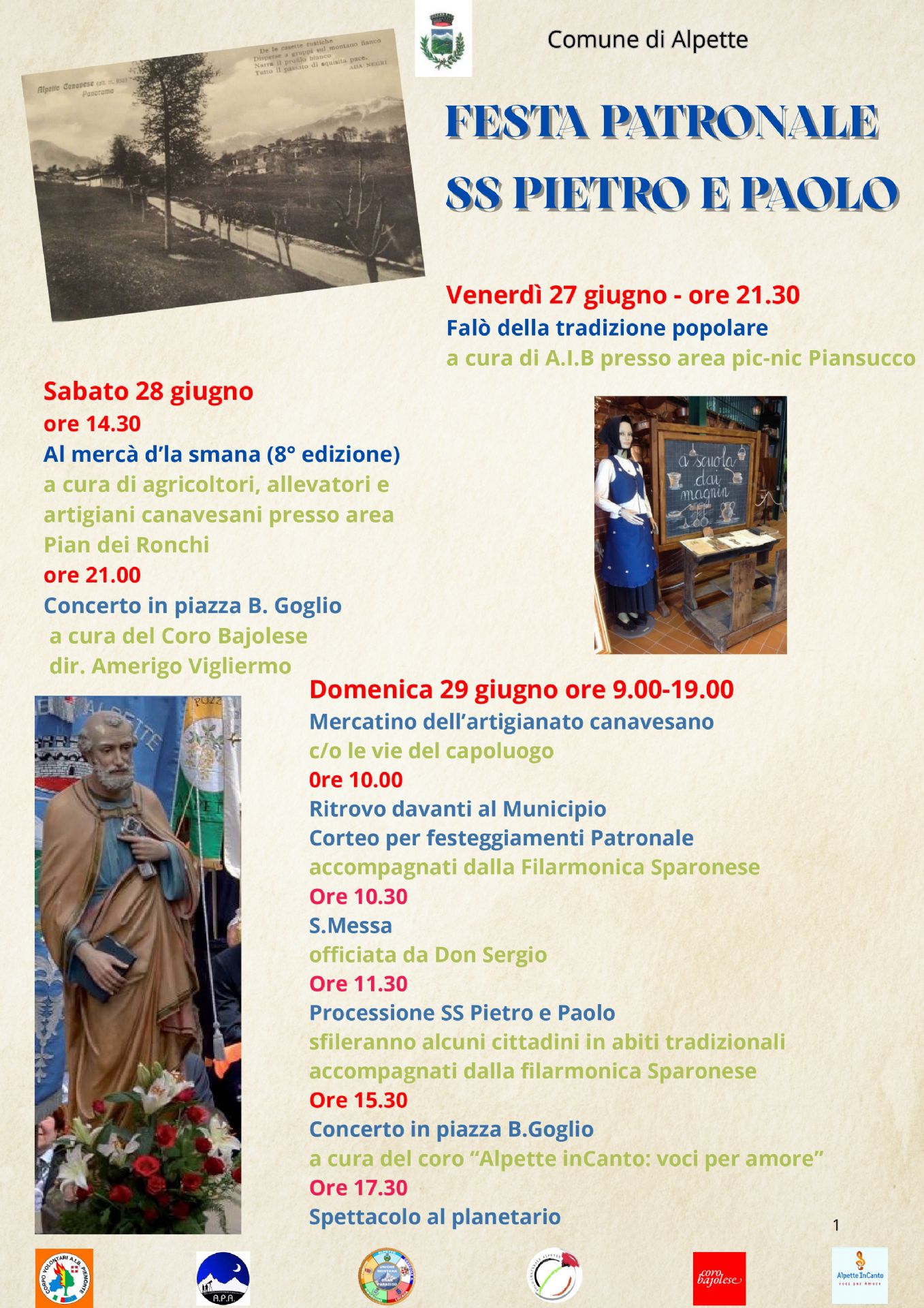 - Domenica 29 giugno 2025: dalle ore 9,00 alle ore 18,00 - Piazza Goglio e vie limitrofe, Mercatino artigianale canavesano - ore 10,00 Santa Messa con processione per le vie del concentrico accompagnata dalla Banda Filarmonica Sparonese e nel pomeriggio ore 15,30 - Piazza Goglio Concerto con il Coro Alpette Incanto, e a seguire alla ore 17,30 spettacolo presso il Planetario Astronomico di Piazza Gran Paradiso.