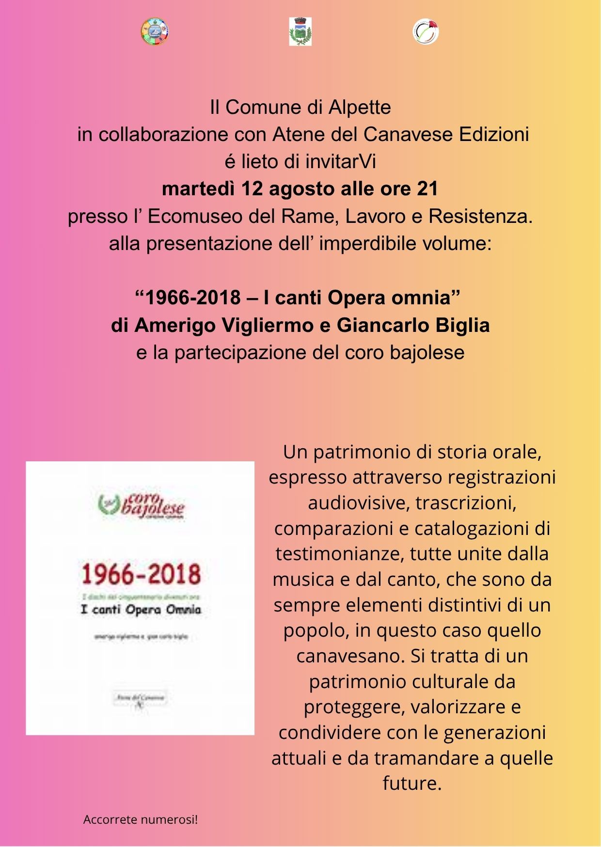 Il Comune di Alpette in collaborazione con la casa editrice "Atene del Canavese Edizioni" presenta presso l'Ecomuseo del Rame. Lavoro e Resistenza, martedì 12 agosto 2025, ore 21,00 il volume: "1966-2018 - I Canti Opera Omnia" di Amerigo Vigliermo e Giancarlo Biglia con la partecipazione del Coro Bajolese.