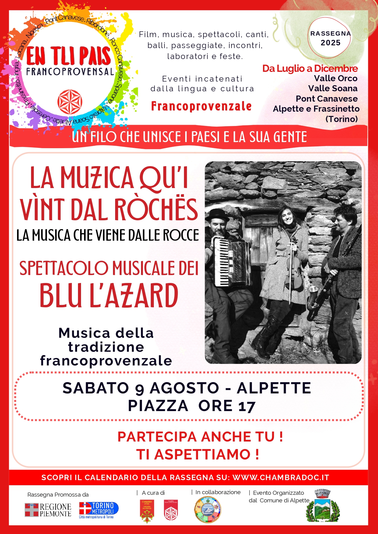 L'Associazione Chambra D'Oc e il Comune di Alpette organizzano per sabato 9 agosto 2025, alle ore 17,00 presso la Piazza Goglio Battista "Titala", una manifestazione musicale denominata "La muzica qu'i vint dal ròches" con il gruppo musicale dei Blu L'Azard.