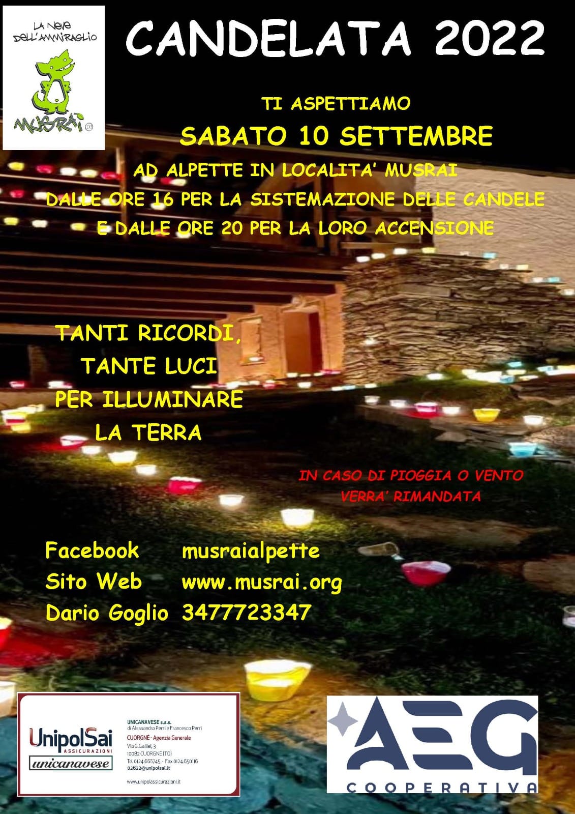 Sabato 10 settembre ad alpette in località Musrai dalle ore 16:00 per la sistemazione delle candele e dalle ore 20:00 per la loro accensione.