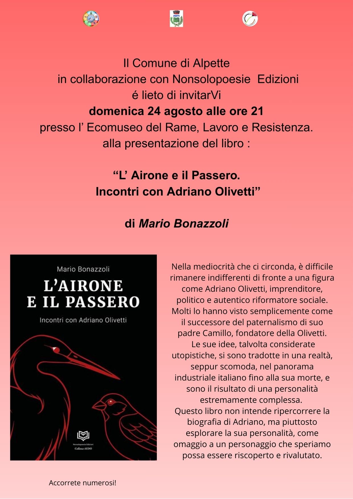 Il Comune di Alpette in collaborazione con la casa editrice "Nonsolopoesie Edizioni" presenta presso l'Ecomuseo del Rame, Lavoro e Resistenza, domenica 24 agosto 2025, ore 21,00 il libro "L'Airone e il Passero" dello scrittore Mario Bonazzoli.